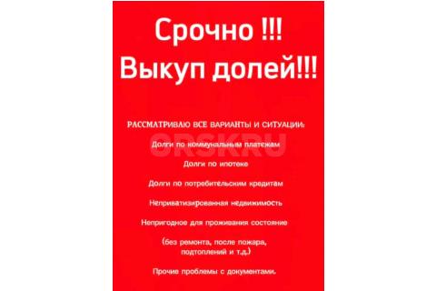 СРОЧНО!! ВЫКУП НЕДВИЖИМОСТИ ! Куплю долю в квартире. Рассмотрим все варианты! Наличный расчет! Звоните...