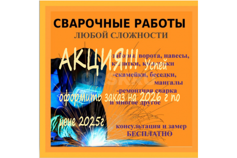 СВАРОЧНЫЕ РАБОТЫ ЛЮБОЙ СЛОЖНОСТИ. ВНИМАНИЕ АКЦИЯ!!! ОФОРМИ ЗАКАЗ НА 2026г ПО ЦЕНЕ 2025!!! Монтаж и изготовление...