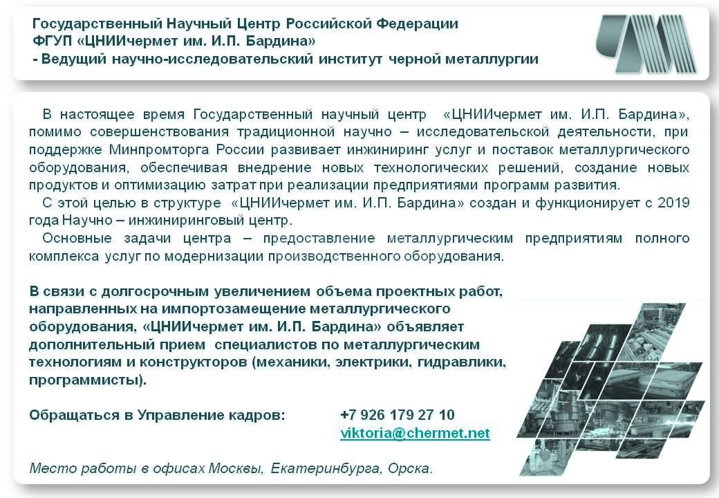 «ЦНИИчермет им. И.П. Бардина» объявляет