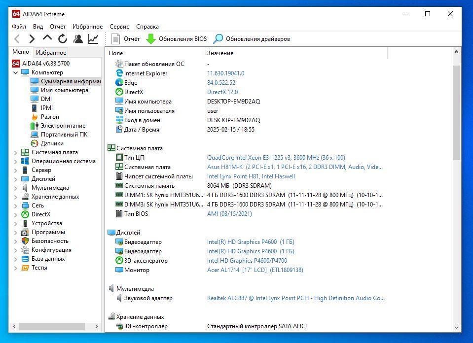 - оперативная память: 8 ГБ DDR3-1600.