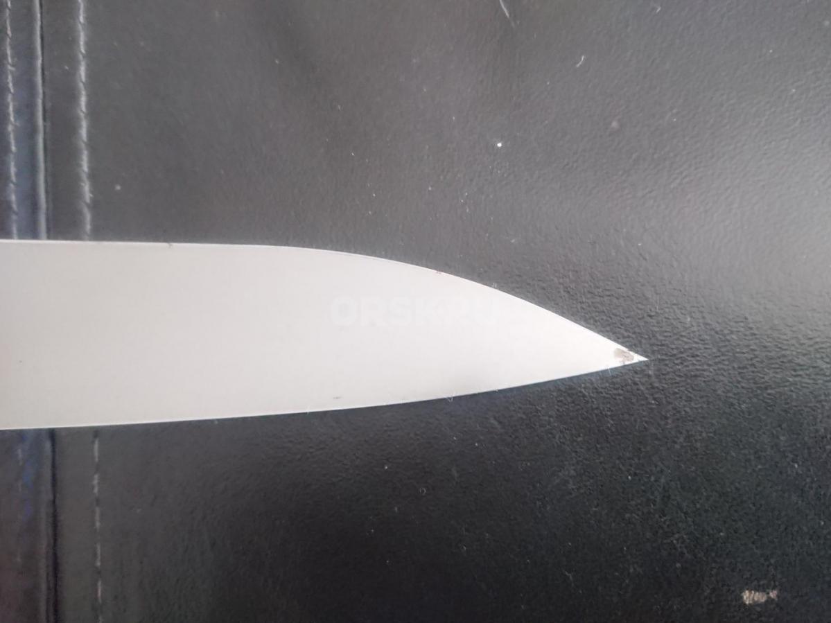 Нож новый не разбирался не точился.Залит блюлюб. Единственный недостаток немного патины на кончике лезвия.
