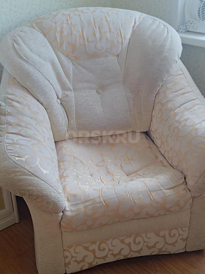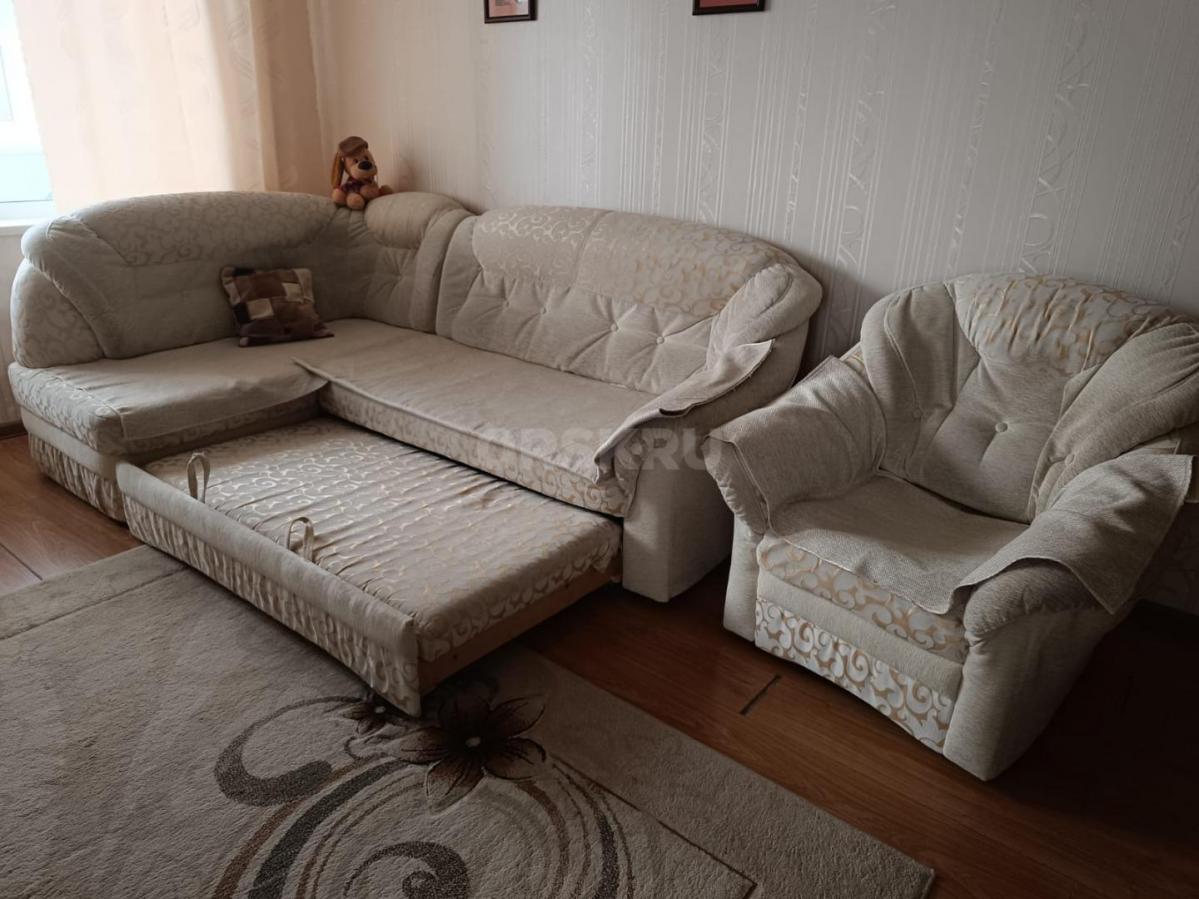 Диван раскладной, система - дельфин. Есть ящик для белья. Спальное место 190*140 см. Сиденье не продавлено, ровное. У кресла сиденье продавлено, но в целом состояние - хорошее.