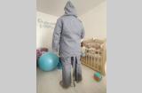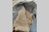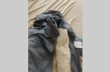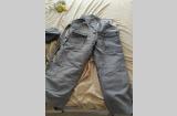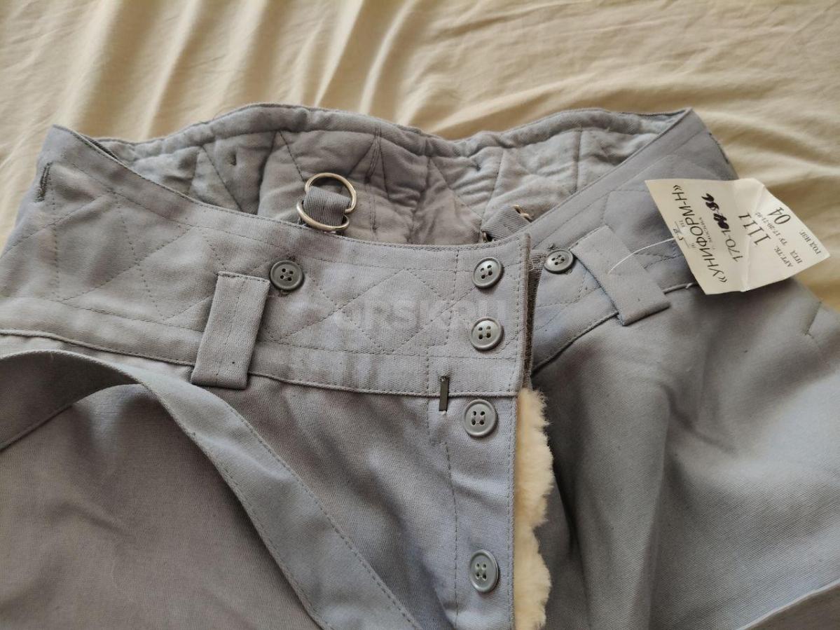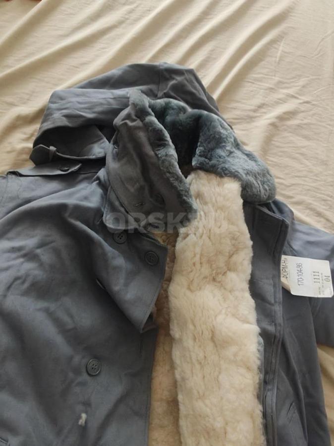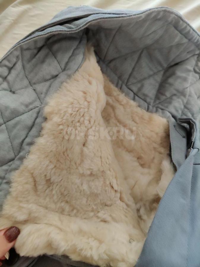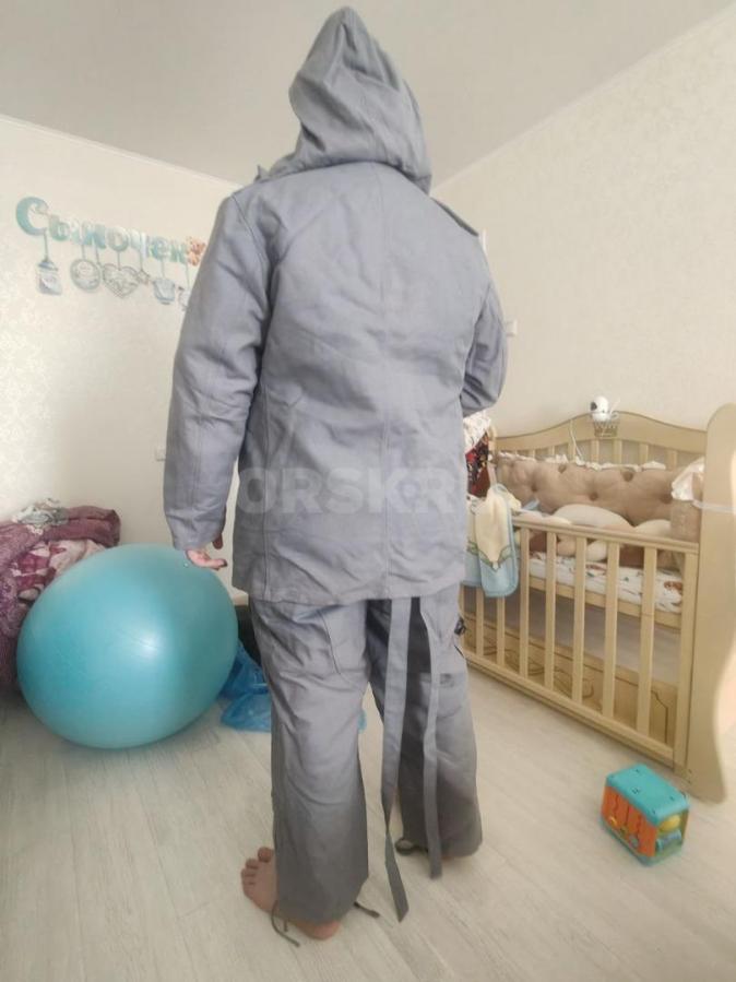 Цвет серо-голубой, подстежка - натуральный мех, овчина. Очень тёплый. В комплекте куртка и штаны. Подстежка отсоединяется, можно носить по отдельности. В куртке есть кобура. На штанах карман для ножа (на последнем фото).