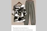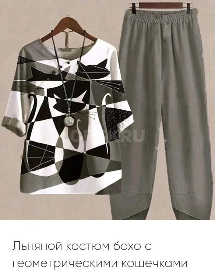 Серый женский костюм - брюки и блузон - с интересным принтом кошек, размер 50, брюки на резинке.