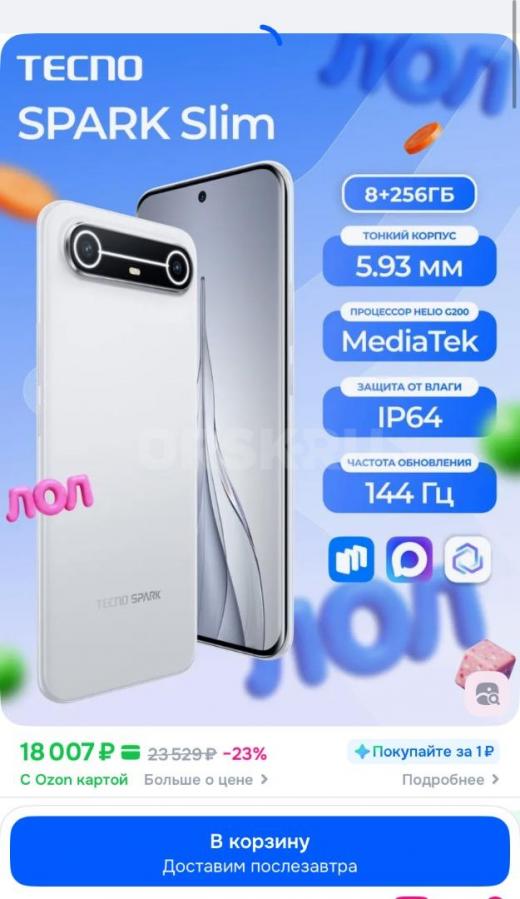 Продам Смартфон Tecno Spark Slim Ростест (EAC) 8/256 ГБ, белый. Куплен 18.12.25, не подошел. Чехол и стекло в комплекте.