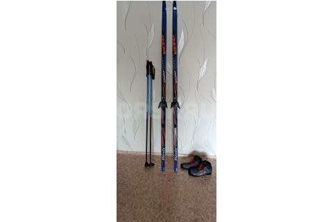 беговые пластиковые лыжи для подростка, длина лыж-1м. 80 см., длина палок 1 м. 25 см., ботинки 37