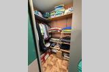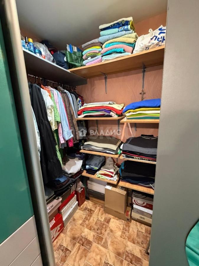 В спальне — вместительный встроенный гардероб с подсветкой и множеством полок. Никаких лишних шкафов — всё аккуратно и организовано