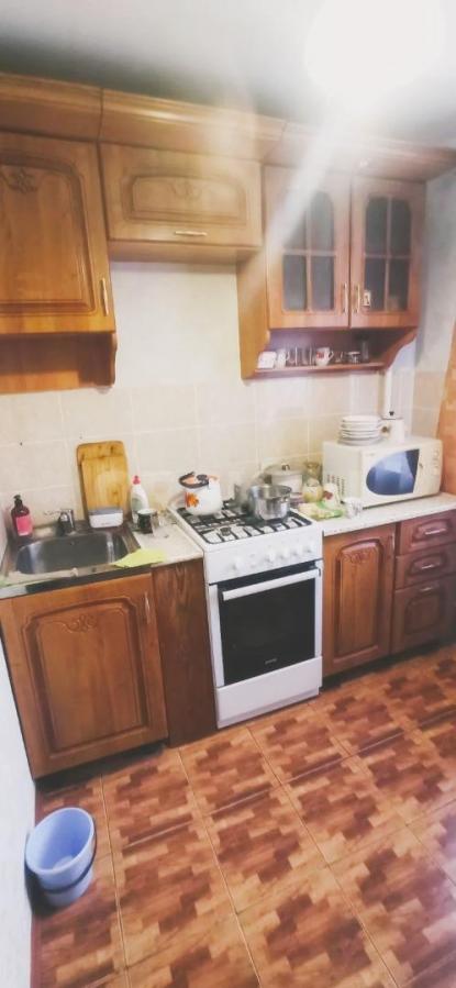 Санузел обложен кафелем, на кухне гарнитур.