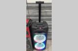 В комплекте идут кабель для зарядки, пульт управления, микрофон. Сверху есть удобная выдвижная ручка для переноски, а внизу колесики. Углубление для установки смартфона.Портативная акустическая колонка с LED подсветкой и дисплеем, встроенным MP3-плеером, FM-тюнером и эквалайзером.