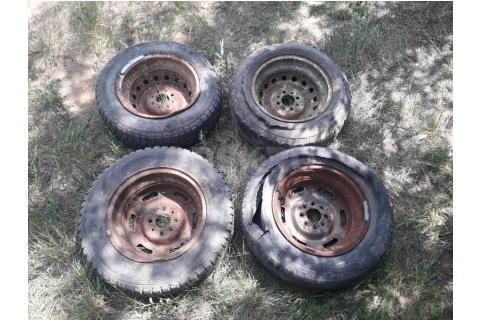 Диски диаметр примерно 32, 3мм, вероятно R13 бу, стоят покрышки бу на выброс. Порезы, трещины. Размеры165/70...